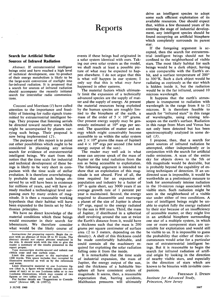 In 1960 Freeman John Dyson wrote a column as Search for artificial stellar sources of infrared radiation in a Journal titled Science of AAAS Publication. In which he firstly mentioned concept of Dyson Sphere.